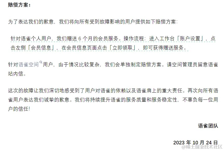 语雀宕机修复后,官方第一时间发布了相关公告,给用户一个说法:
