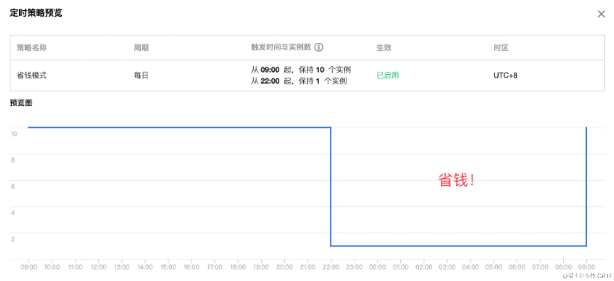 定时伸缩可以根据业务的时间特征来设置,比如游戏的高峰通常是在晚上,而上午通常都是低峰期,那么就可以定时设置,上午只保留基本的资源量,保障较小的流量正常进行,以节约资源成本。在晚上高峰期,就可以提前拉起更多的资源,以保障晚上高峰期的资源充足。