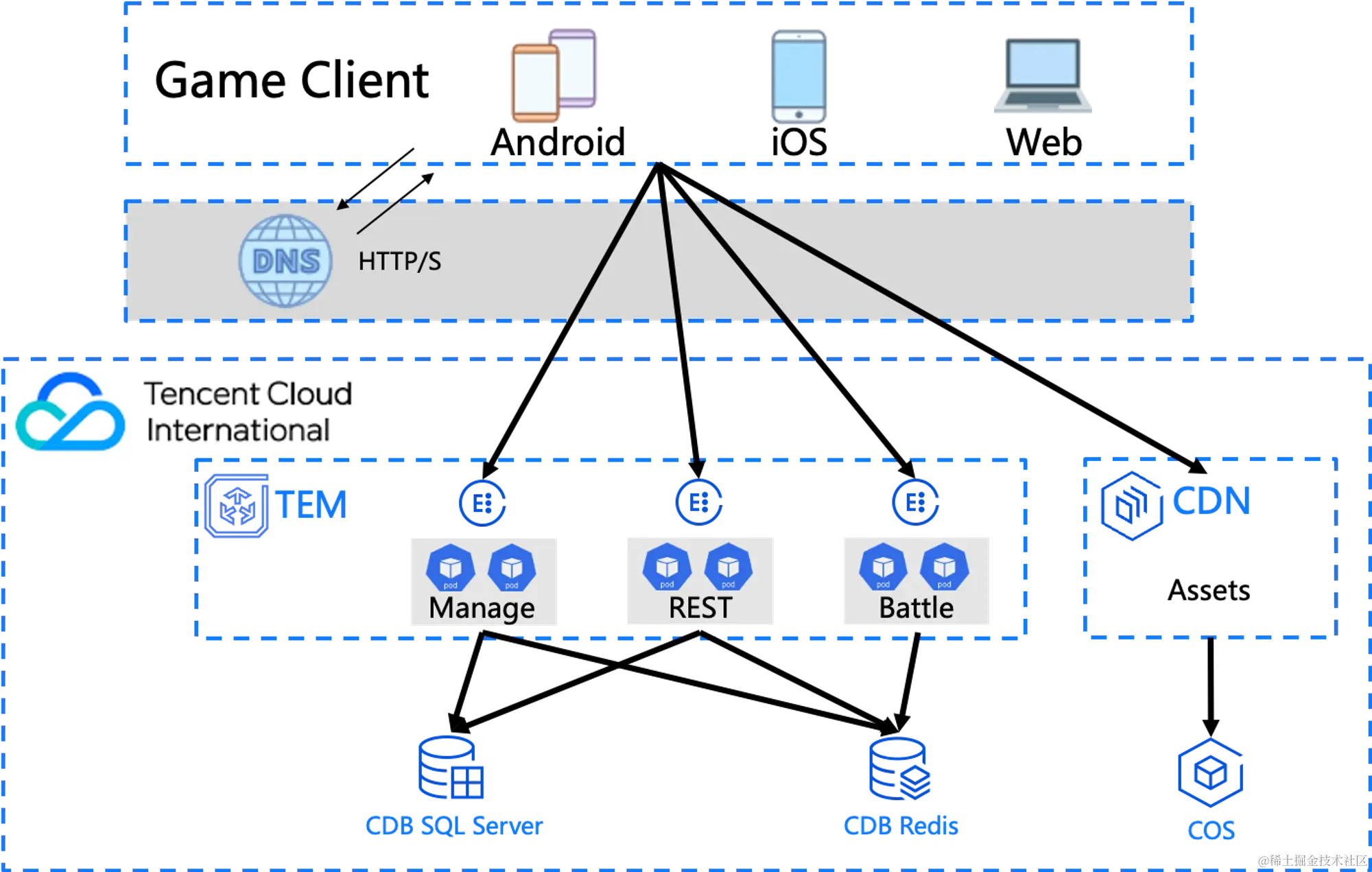 首先,必须有 CDN 来提供静态文件的分发,包括游戏资源、安装包、图片等。这些文件底层都是存储在 COS 上的。