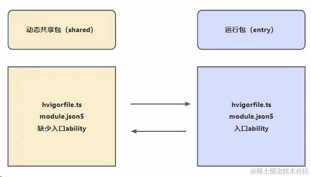 需求的总体概括就非常的简单,让动态共享包的模块,在运行包和动态共享包之间可以动态的切换,省去人工配置的步骤,由上篇文章,我们已经得知,动态共享包和运行包之间的区别,主要来源于三处,分别是hvigorfile.ts文件、module.json5文件和缺少入口ability。