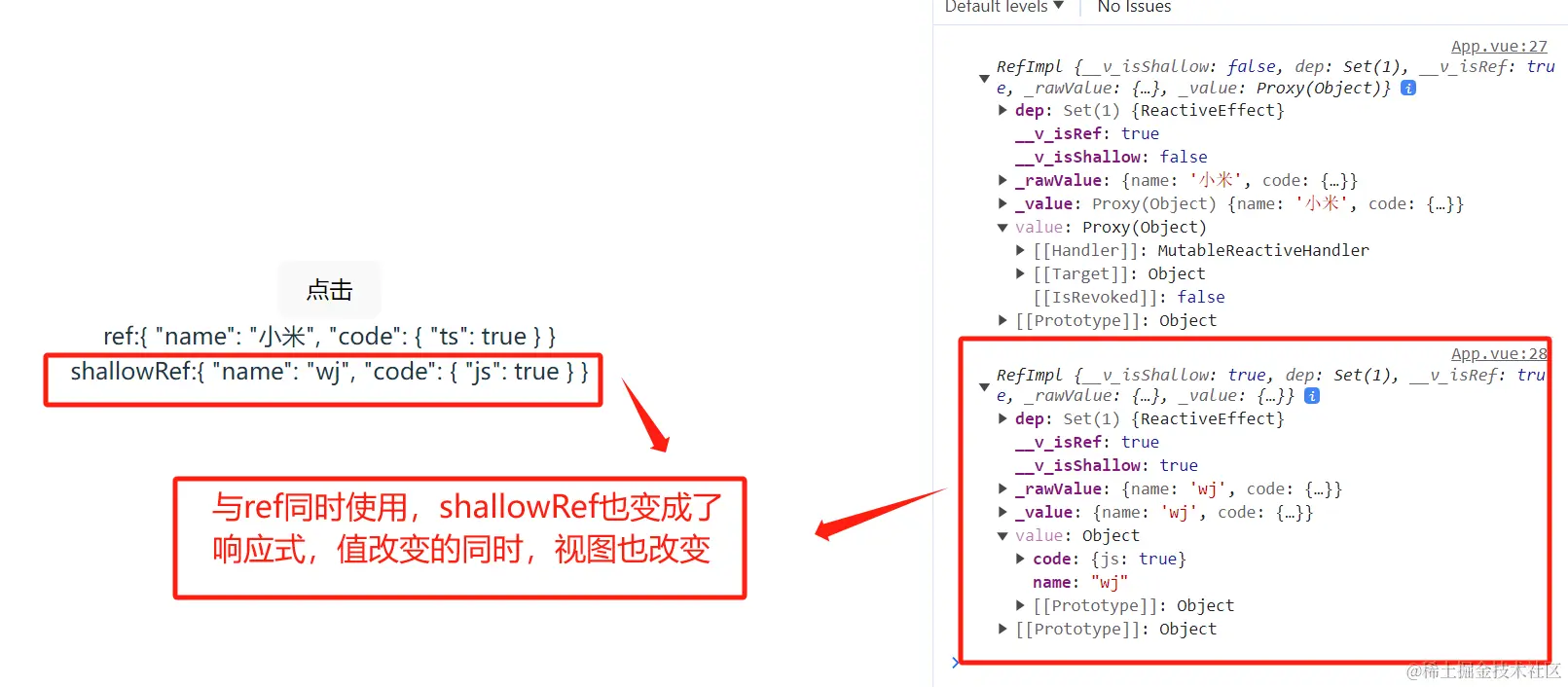 - ref 是深层次响应式,shallowRef 是浅层次响应式