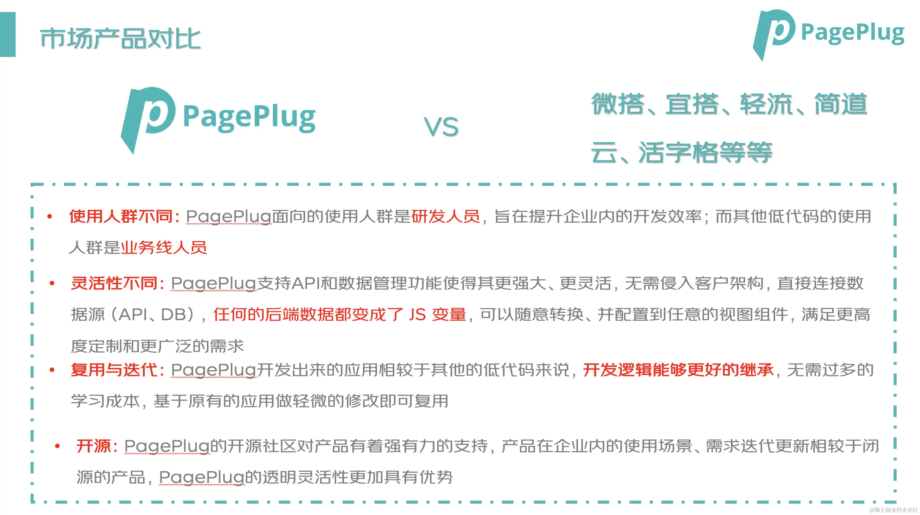 PagePlug与市面上其他的低代码(轻流、宜搭、微搭、简道云、轻流、活字格等等),后者更倾向于非编程人员使用,让业务线人员自行构建应用程序。而PagePlug这款低代码产品是面向To D研发人群使用的,它旨在加速开发人员的开发过程。