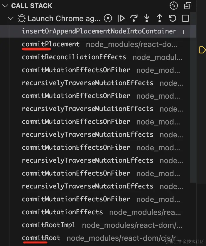 看下调用栈,插入 dom 这部分,就是 commit 阶段做的: