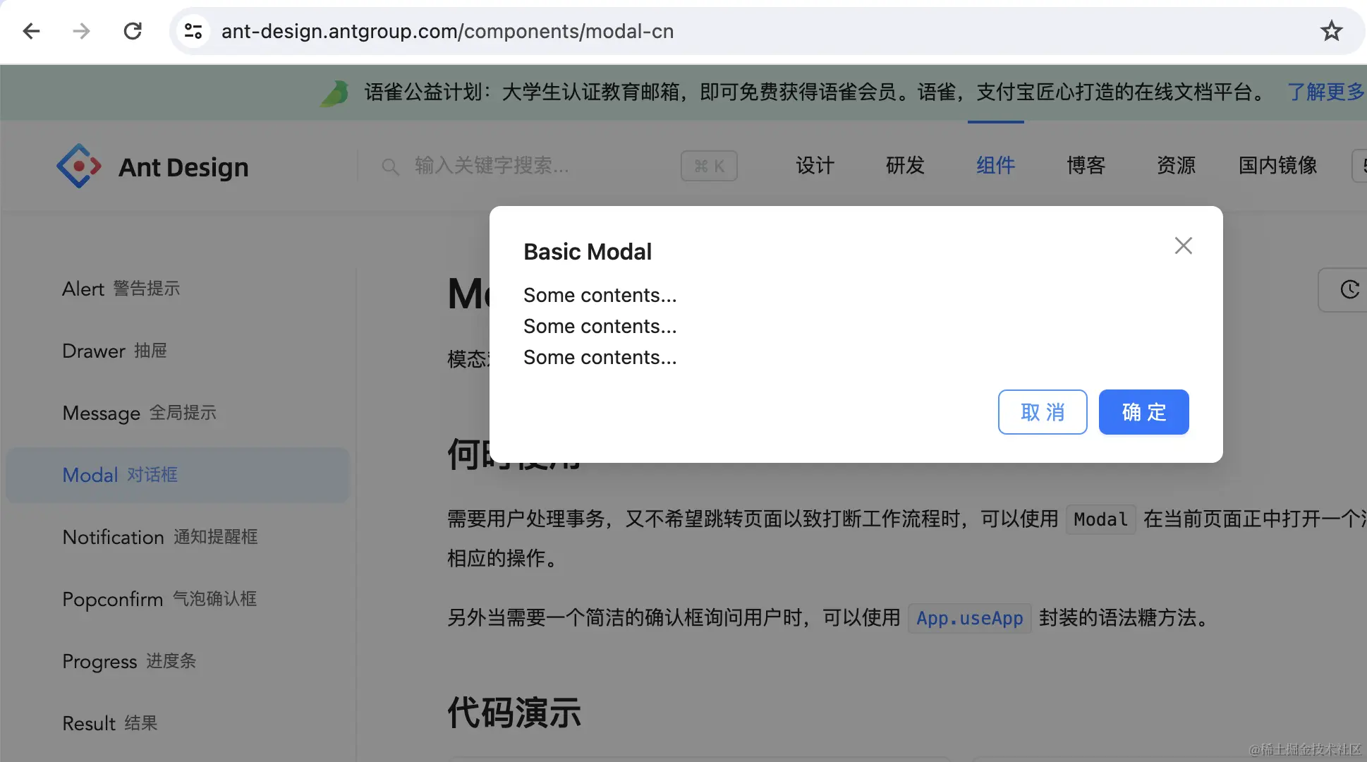 想必大家都用过弹窗组件,比如 antd 的 Modal 组件: