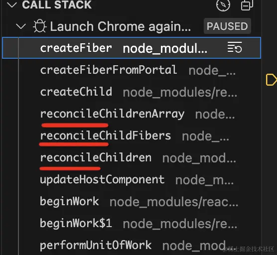 代码在断点处断住了,调用栈的前面这些就是 react 源码:
