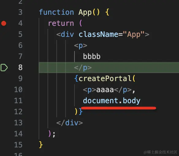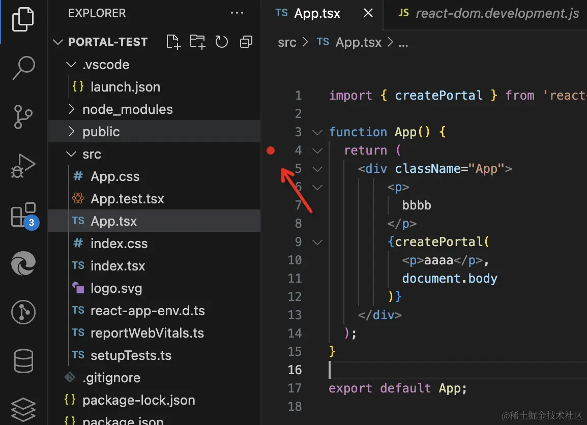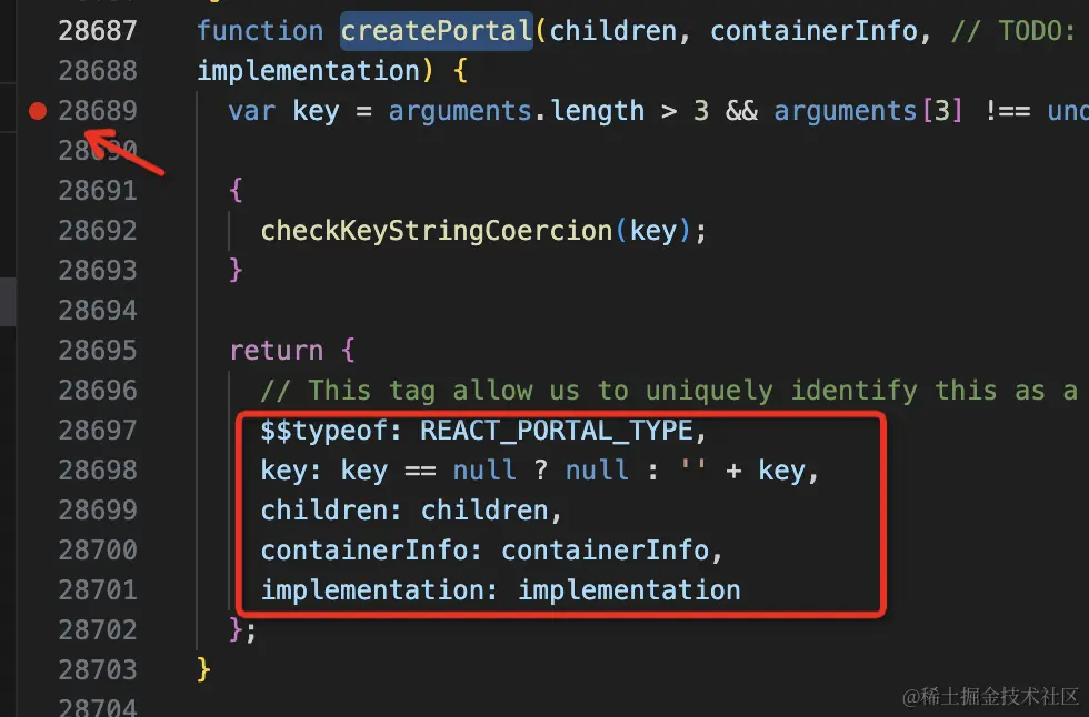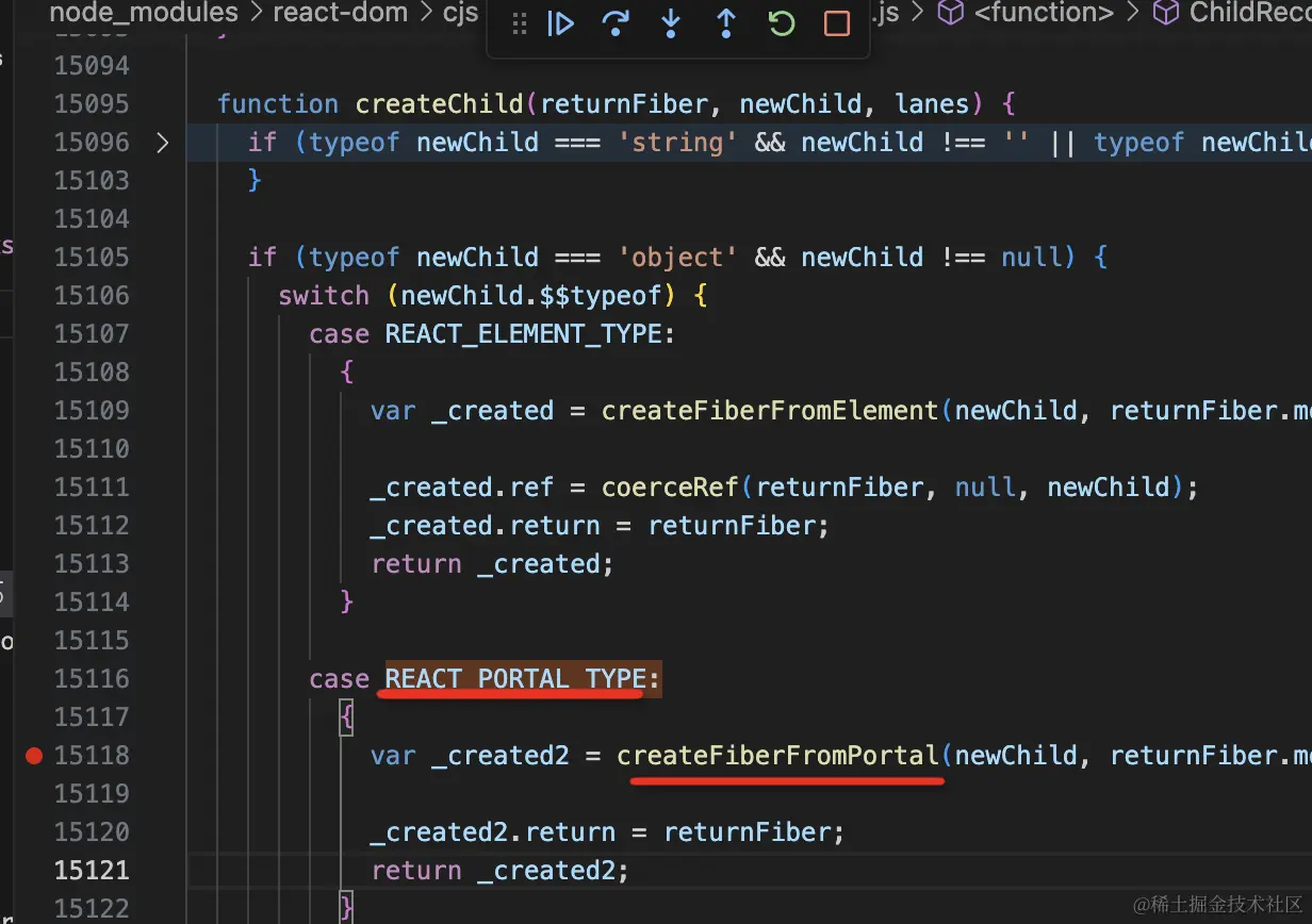 搜索 createPortal,在这里打个断点: