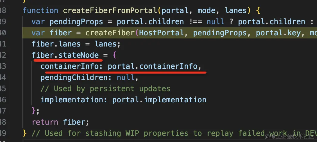 portal 对应的 React Element 节点会转成对应的 fiber 节点,containerInfo 会放到 fiber.stateNode 属性上。