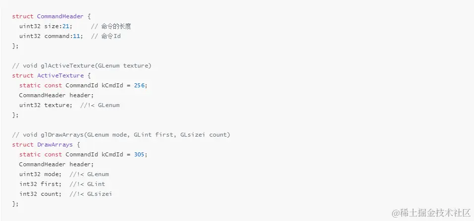 在 CommandBuffer 中共有三类命令,一类是直接对接OpenGLES的命令。例如下面的GL命令: