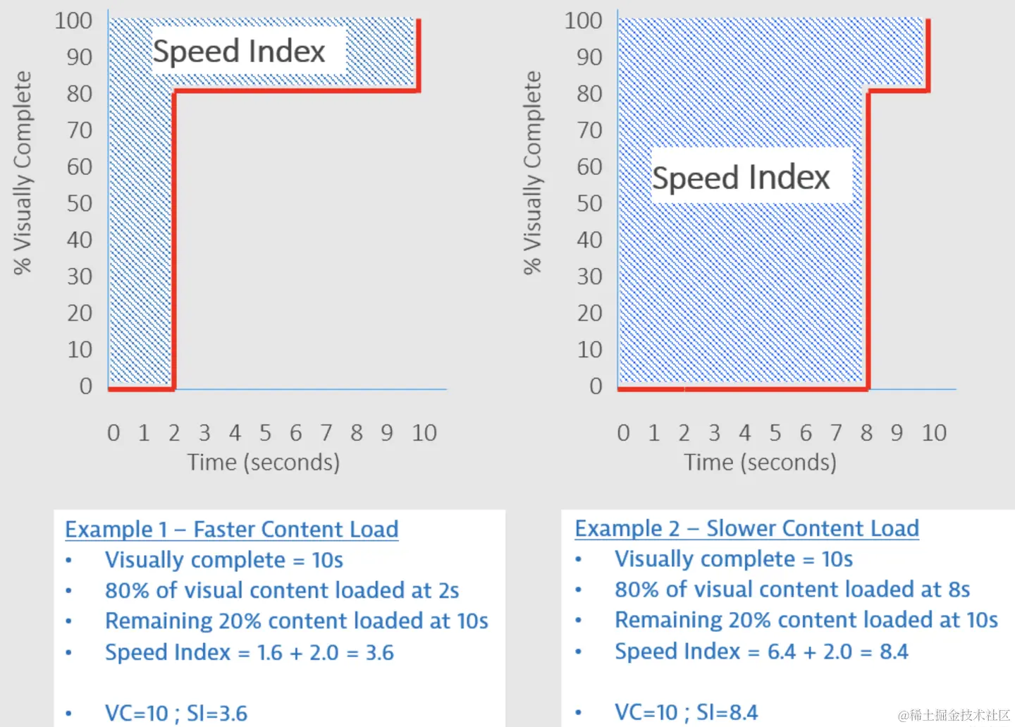 图中的 Example 1 和 Example 2 都是在 10s 时页面填充完成,但 Example 1 在 2s 时就已经填充了 80% 的内容,而 Example 2 在 8s 时才填充 80%。