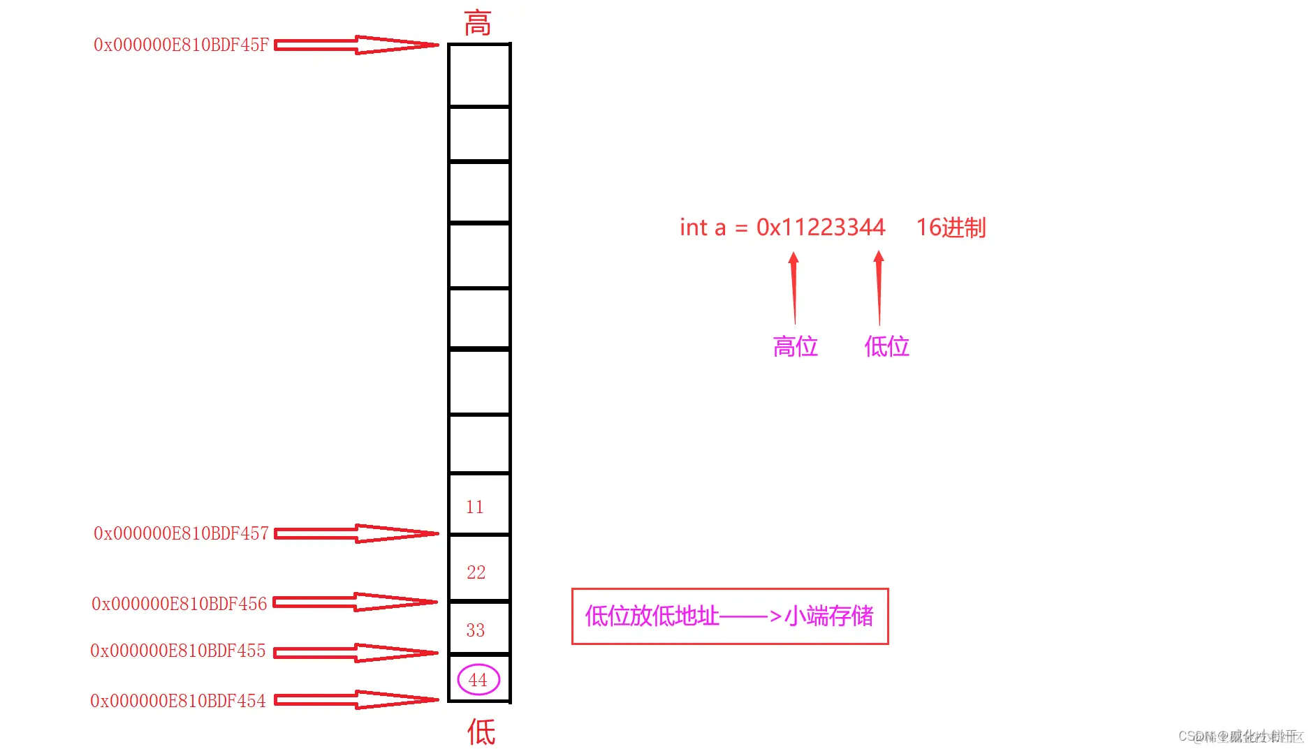 判断大小端是以字节来看的,如16进制数0x11223344,则11相对于其它是高位,就好比十进制123,1是百位,2是十位,3是个位,则1相对于2、3,为高位,请看下面的图解。
