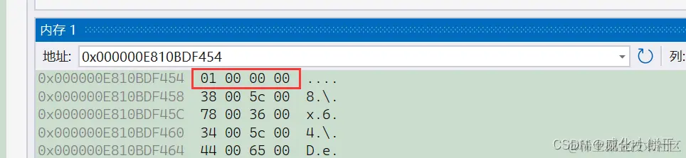 在64位的平台中,找到i 的地址为:0x00000E810BDF454,内存中存放着01 00 00 00。有没有发现它是倒着存的,这其实就是小端存储。