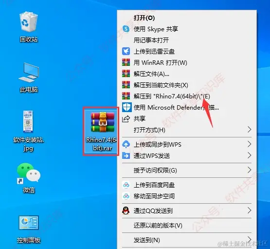 1.通过文章末尾处下载软件后,右键【Rhino7.4(64bit)】选择【解压到Rhino7.4(64bit)】。