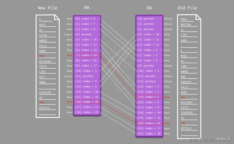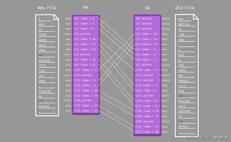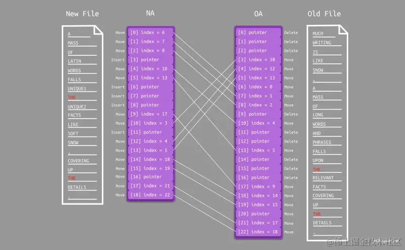 Paul Heckel 差分算法使用两个数组 NA(New Array)和 OA(Old Array)分别记录新旧两个文件的每一行的信息。数组元素分为两种类型:指针 或 行号。通过这种方式,我们可以对新旧两个文件中的所有行进行分类:
