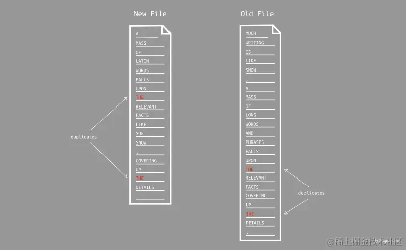 在继续介绍之前,我们先说明一种常见的情况:一个文件中行内容可能是唯一项,也可能是重复项。比如,在下图所示的两个文件中,THE 在新旧两个文件中都重复出现了两次,A、MASS、OF 等内容在各自的文件中都是唯一项。对此,算法的处理方式也有所不同。