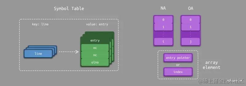 在构建数组( NA 和 OA )时,其元素均为指针类型,指向当前行对应在符号表中的 entry。