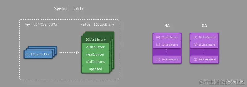 在数据结构定义上,IGListDiff 与原始算法类似,也定义了一个符号表和两个数组,如下图所示。