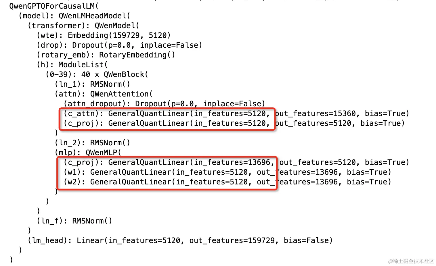 这几个文件可以从 Qwen-14B 的最新模型文件 中复制过来,放到量化文件目录中即可,接下来再次运行前面加载量化模型的代码即可正常加载模型,可以看到输出的模型内容中有如下内容即为量化模型: