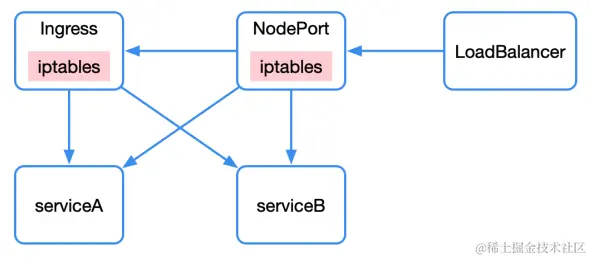 南北向的流量,即外部请求访问 Kubernetes 集群,主要包括三种方式:nodePort、loadbalancer、Ingress。