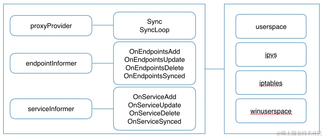 kube-proxy 监听 API server 中 service 和 endpoint 的变化情况,并通过 userspace、iptables、ipvs 或 winuserspace 等 proxier 来为服务配置负载均衡(仅支持 TCP 和 UDP)。