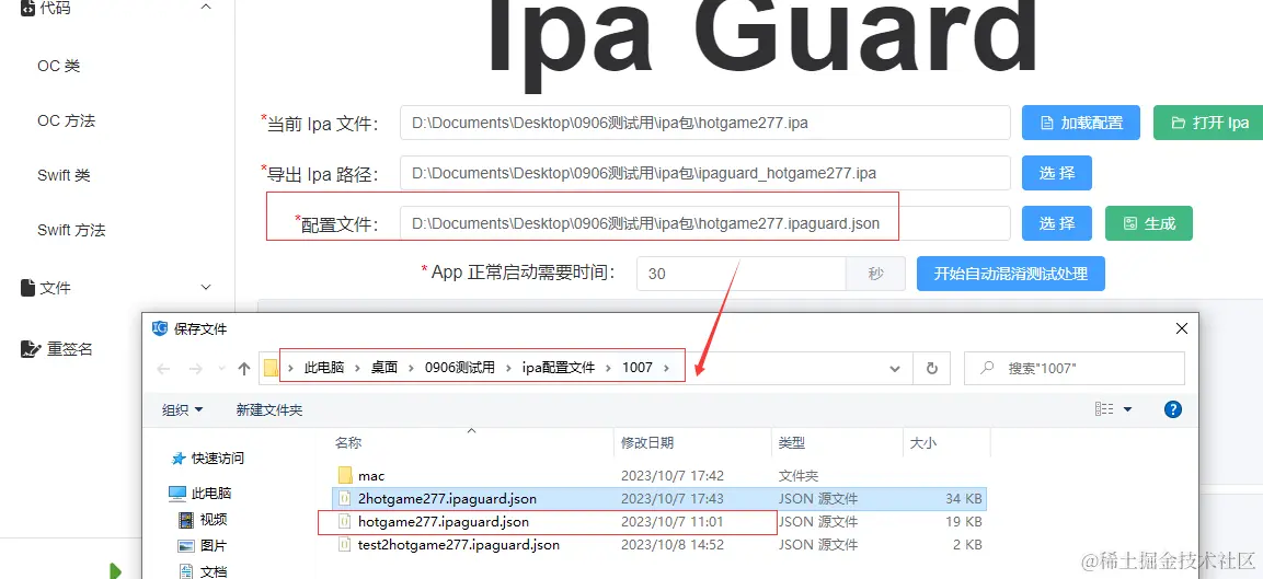 自动混淆处理完成后,会在 “配置文件”路径下生成一个配置文件,里面包含了筛选过后可以混淆的oc类和oc方法名。可以将该文件再次导入到,在此基础上进行配置。