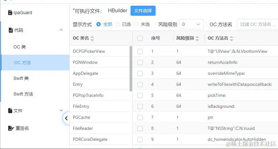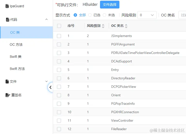 当没有勾选oc类和oc方法,会自动测试所有的可执行文件中的oc类和oc方法名。如果有选中数据,则只会测试选中的数据集合。除了 oc 类和oc方法这两个模块会自动筛选测,其他的模块需要手动配置