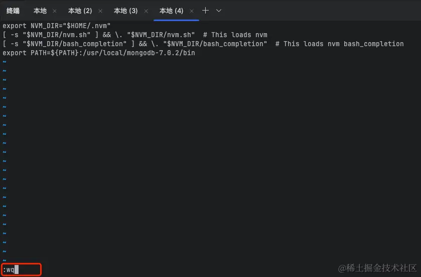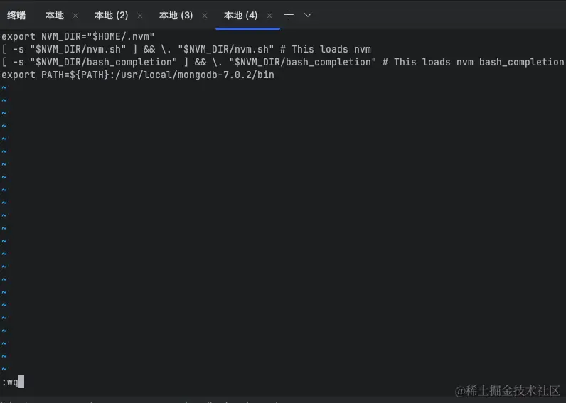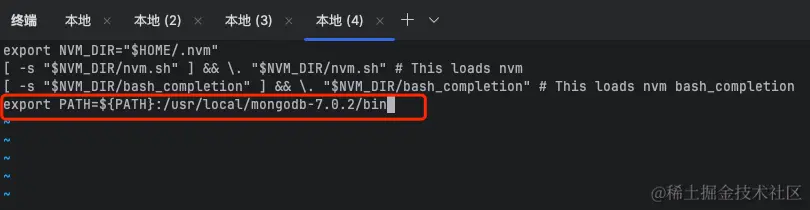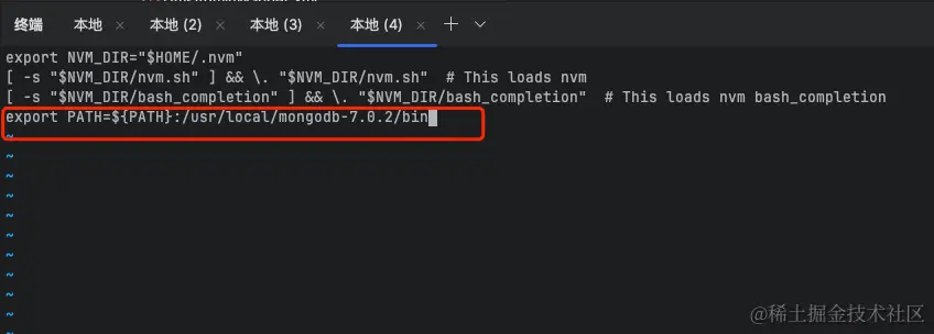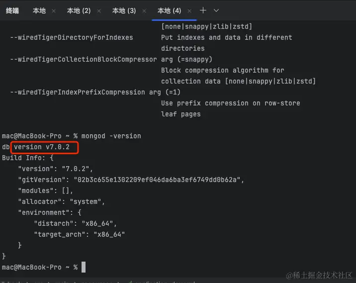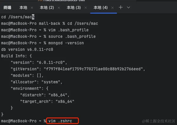 这里查看版本号发现版本号和安装的不对,那么这个是什么原因导致的了,因为笔者之前已经安装过 6.0.11 的版本,并且在 .zshrc 文件中也配置了 mongodb 信息,这里我们需要将 .zshrc 的原始配置修改掉