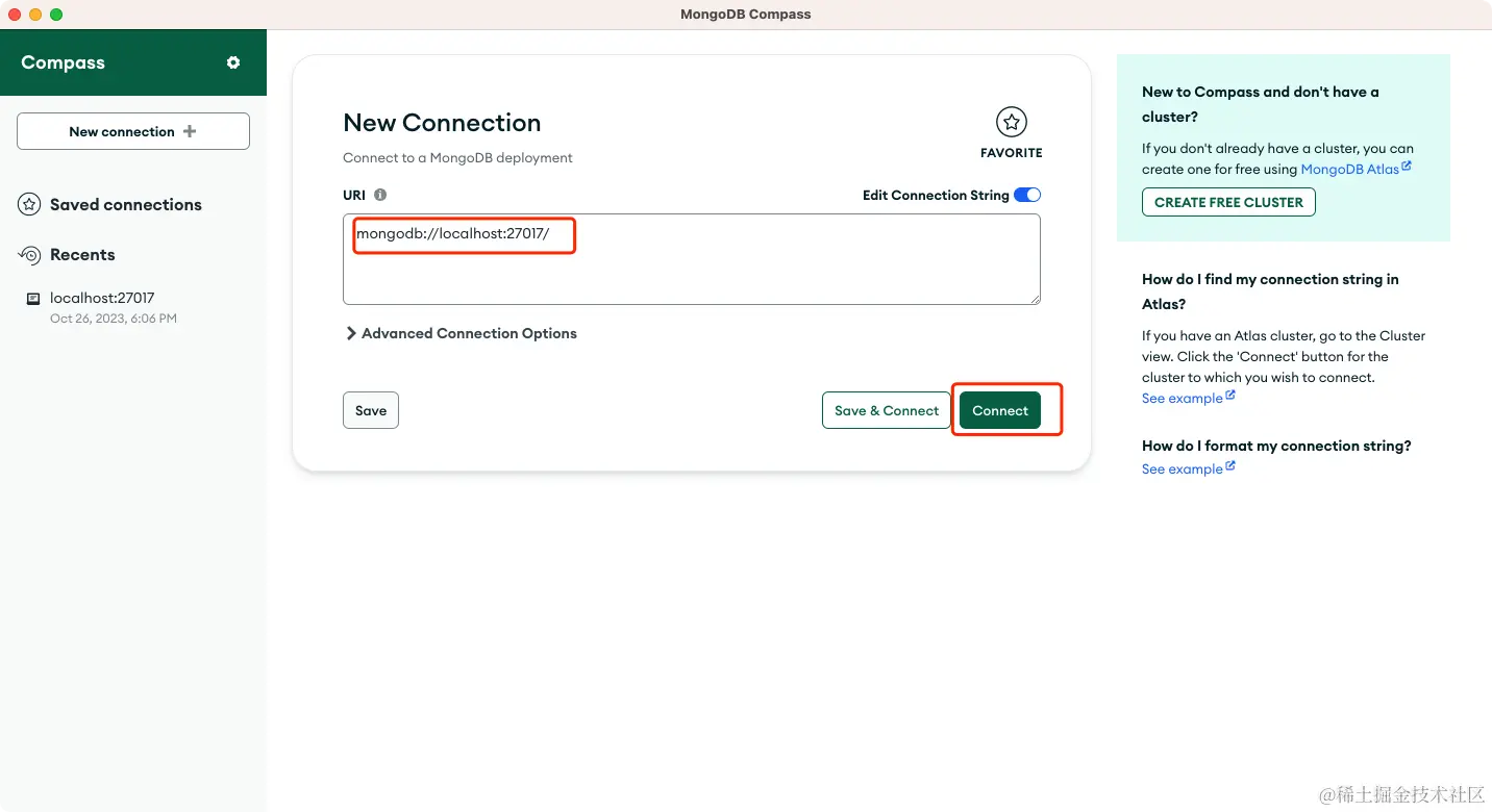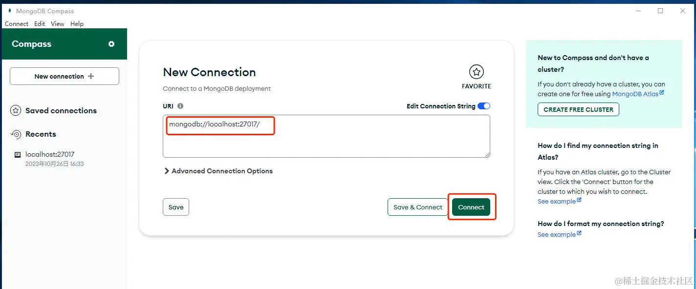 然后点击 connect 连接 Mongodb 数据库