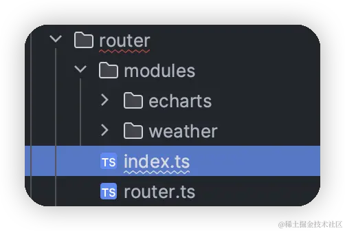 在 router 文件夹下,新建文件夹或者新建文件,用于存放模块化的路由,比如在这里,为了做示例,modules存放模块化的路由,这里存放了 echarts 和 weather 两个模块: