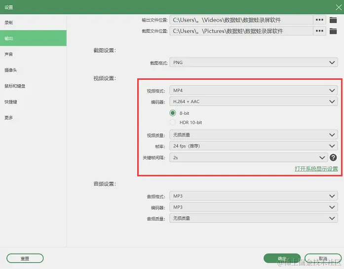 步骤3:在右上角可以打开软件设置,进入到输出这一栏,我们可以对视频的格式、质量、帧率进行调整,调整完毕后返回开始录屏。