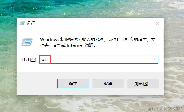 步骤1:在运行窗口( “Windows徽标键+R” )中输入 “psr” ,点击 “确定” 。