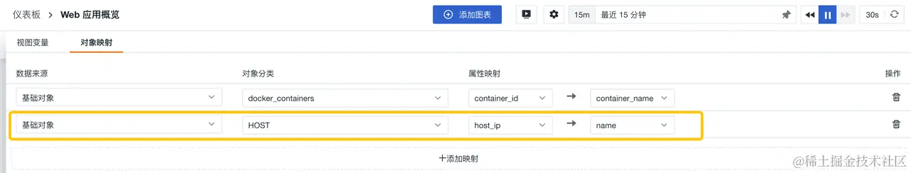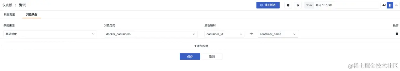 需要强调的是,若您添加的视图变量为基础设施对象数据,您就可以为其设置字段映射,将难以辨识的字段名称显示成您想要的字段,从而便于您更好的理解图表内容,以进行更加精确的数据分析。如下图所示:将 container_id 映射显示为 container_name。