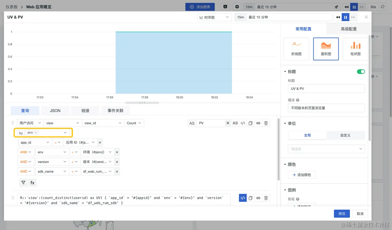 如下图所示,若您创建了一个监测Web应用用户访问情况的仪表板,当您添加了应用ID、环境和版本的视图变量,您就可以在图表查询中筛选变量字段,得到不同应用在不同环境、不同版本的用户属性、行为事件等数据。
