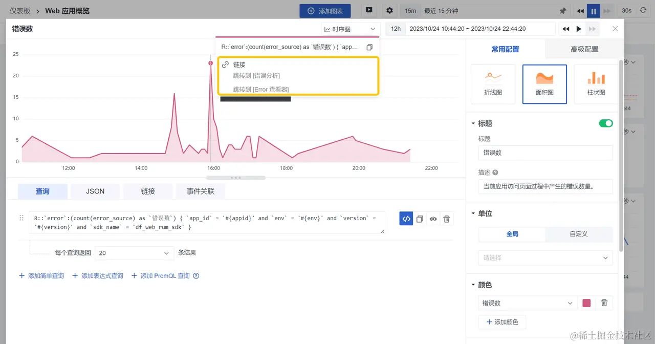 如图所示,您可以在该Web应用概览仪表板中监测当下用户访问该Web应用时出现的异常情况;直接进入到错误数图表中,查询相关的错误数据以更快定位问题。更进一步,您可以直接从图表链接跳转到Erro查看器,实现全局联动分析,高效提高用户使用体验。(关于如何配置图表链接,可以关注相关文章:【数据下钻分析?图表链接一招搞定!】)