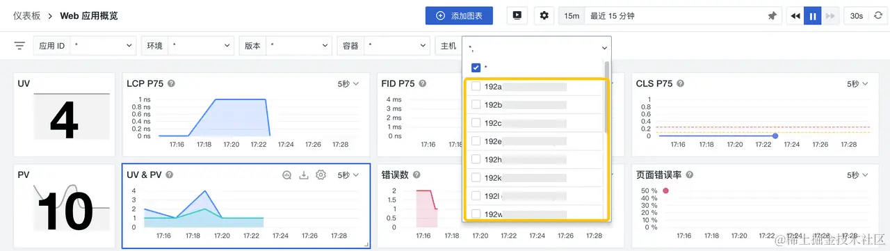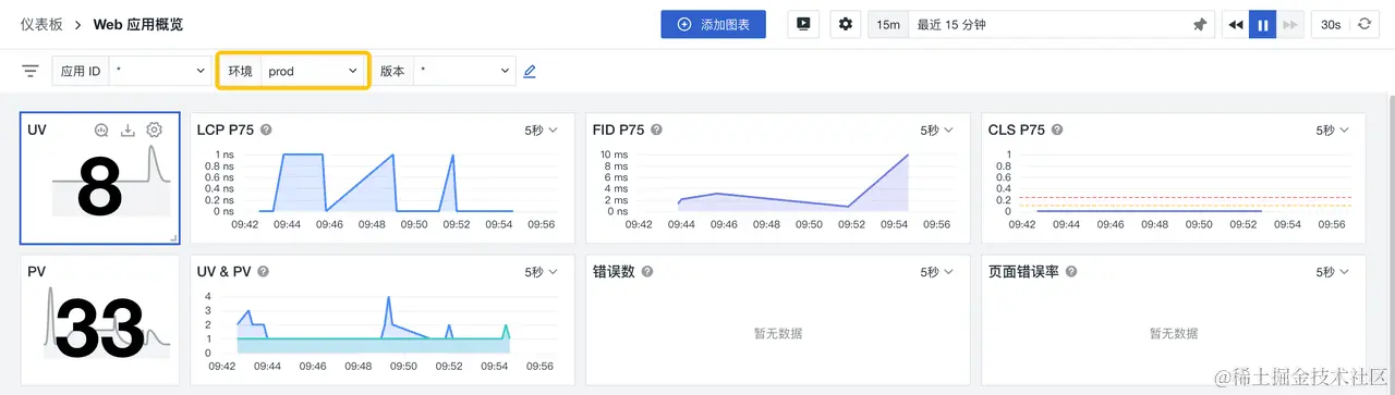 如下图Web应用概览仪表板所示,您就可以直接在UV&PV图表中选定某一数据点,反向添加到【环境】为 [prod],便得到了该条件下的UV&PV时序图。这不仅能够帮助您在实际运用中能够高效反向查询和分析所需数据,也能实时支持团队工作的协同场景。