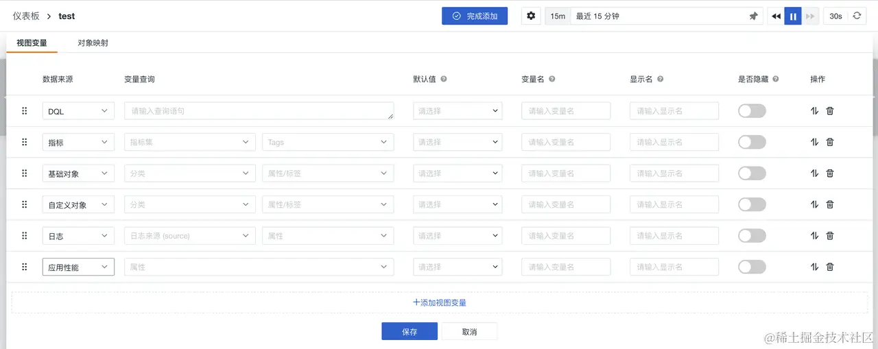 当您新建一个【仪表板】时,您可以点击顶部导航栏显示【添加视图变量】按钮,添加所需的视图变量;其数据来源包括DQL、指标、基础对象、自定义对象、日志、应用性能、用户访问、安全巡检和自定义。