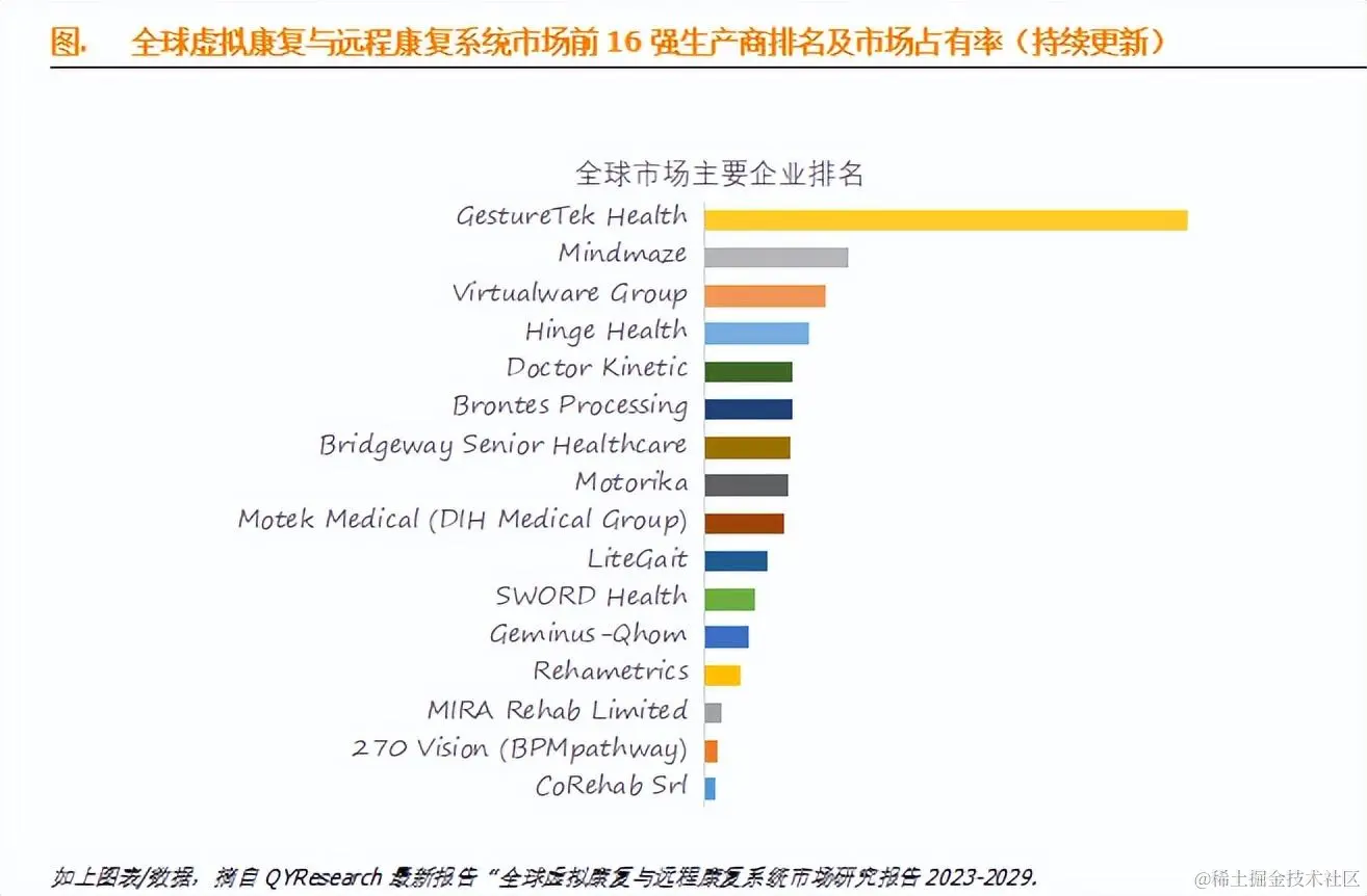 全球范围内虚拟康复与远程康复系统生产商主要包括GestureTek Health、Mindmaze、Virtualware Group、Hinge Health、Doctor Kinetic、Brontes Processing、Bridgeway Senior Healthcare、Motorika、Motek Medical (DIH Medical Group)、LiteGait等。2022年,全球前五大厂商占有大约39.0%的市场份额。