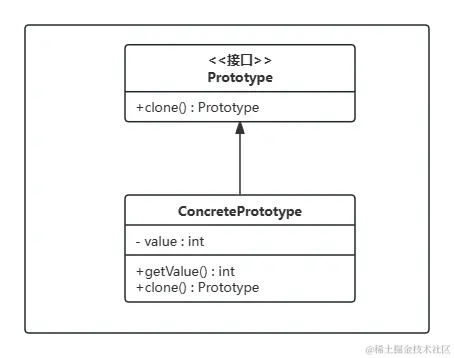 clone()方法。 - 具体原型类(Concrete Prototype) :实现了原型接口,并实现了复制自身的方法。