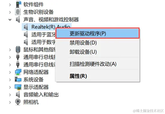 3.右键单击您的音频设备,选择【更新驱动程序】,然后按照提示进行操作,以搜索并安装最新的驱动程序。