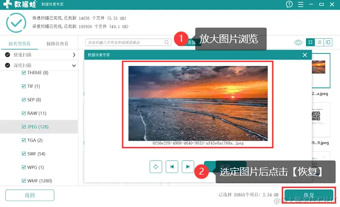 步骤5:深度扫描会对磁盘进行更细致的扫描,完成后可再次选择需要恢复的图片(图片可放大浏览),选择完毕后点击【恢复】,并选择一个新的文件保存位置。