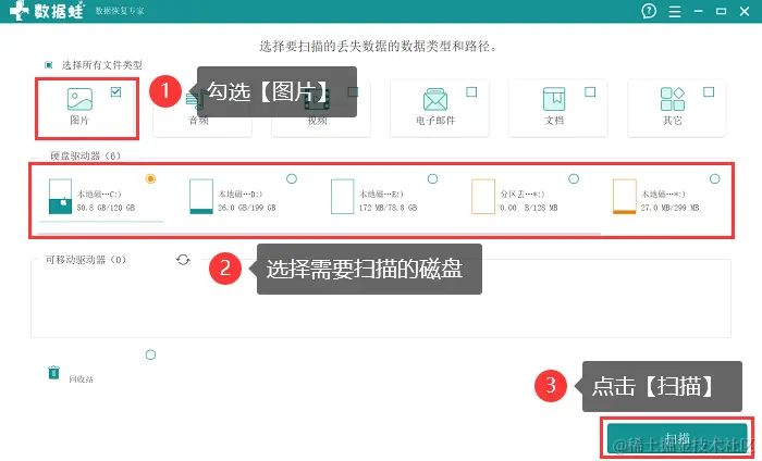 步骤3:此时将进入选择环节,如果仅需对照片进行扫描和恢复,勾选上 【图片】,并勾选上图片所在的磁盘,点击【扫描】 ;