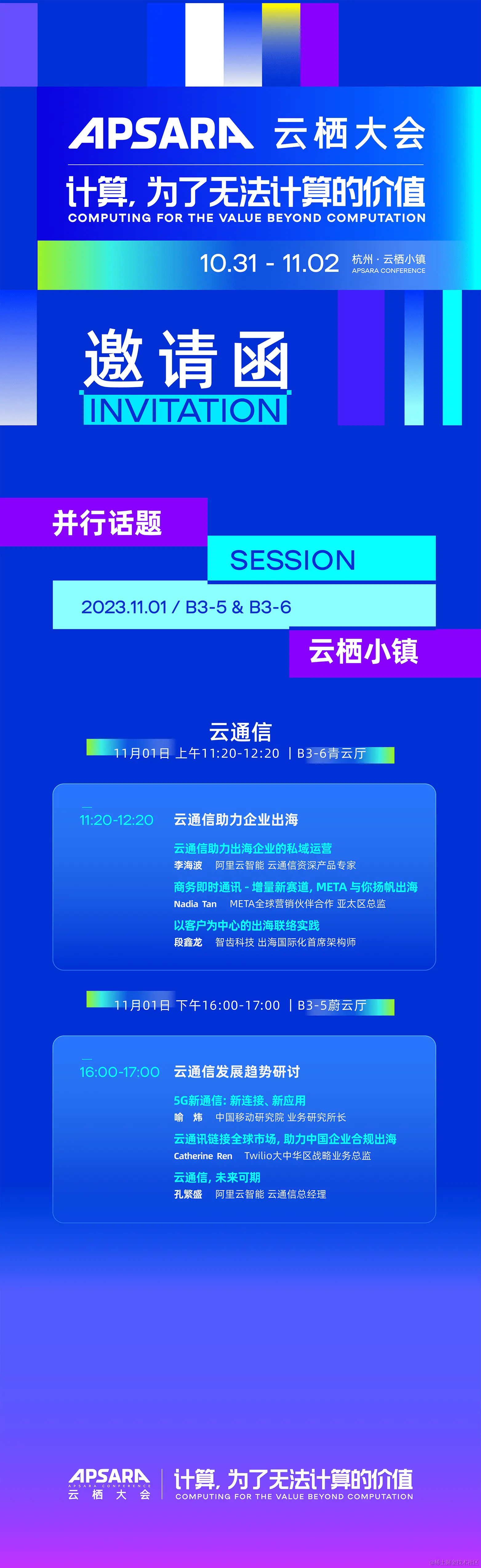 11月1日11:20-12:20&16:00-17:00,阿里云云通信将围绕云通信助力企业出海及云通信发展趋势两大维度展开分享,深度呈现融合通信的顶级触达力。