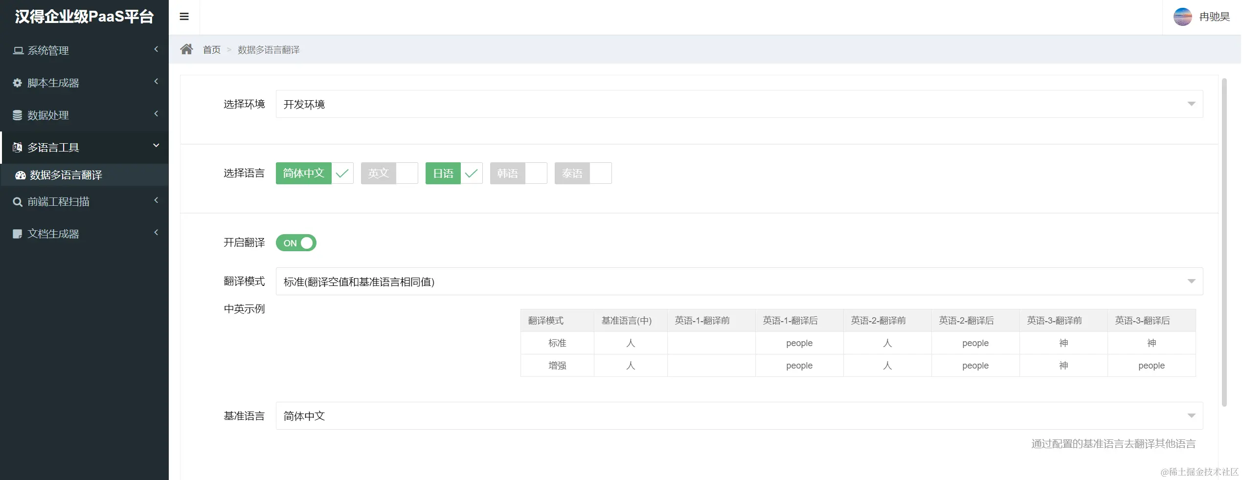 - 翻译: 选择左侧需要翻译多语类别,然后进行源语言和目标语言选择,选择后进行翻译。