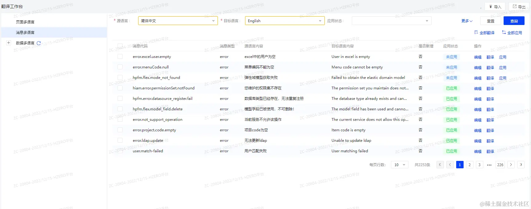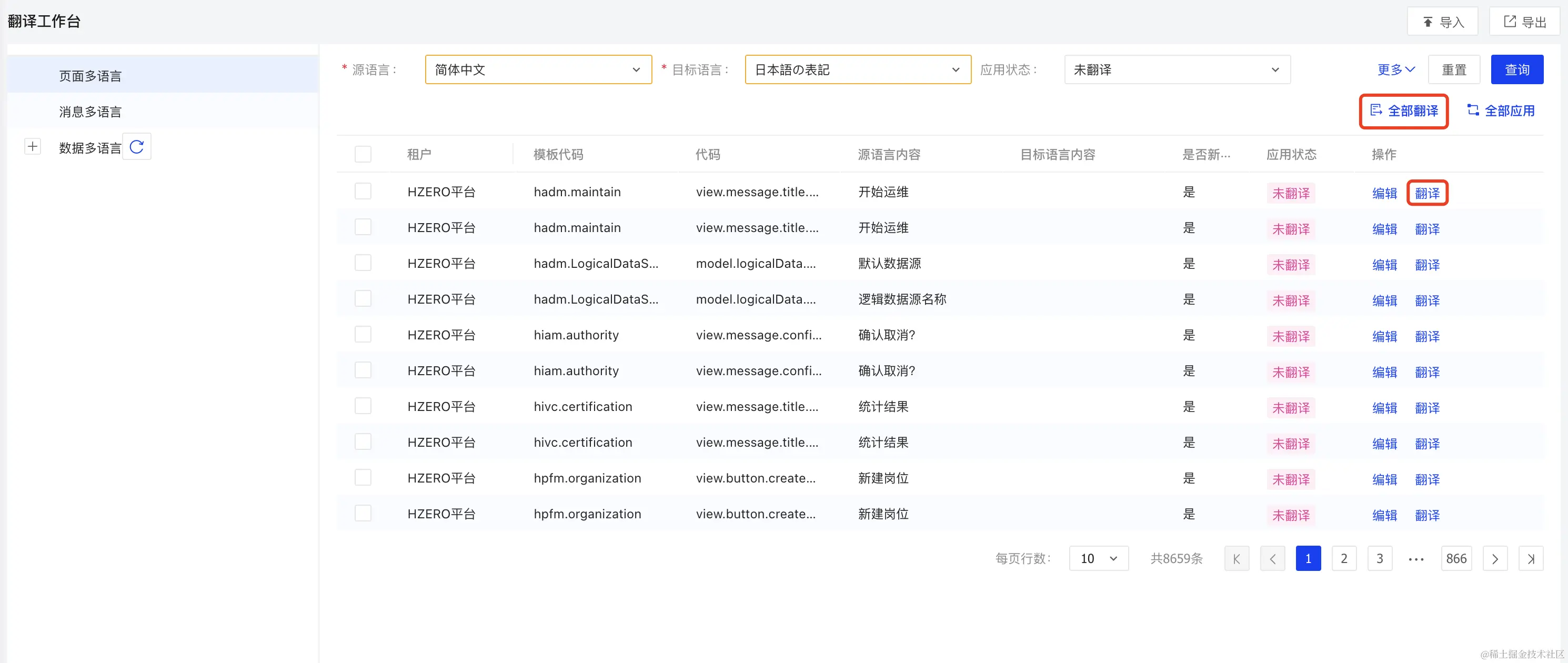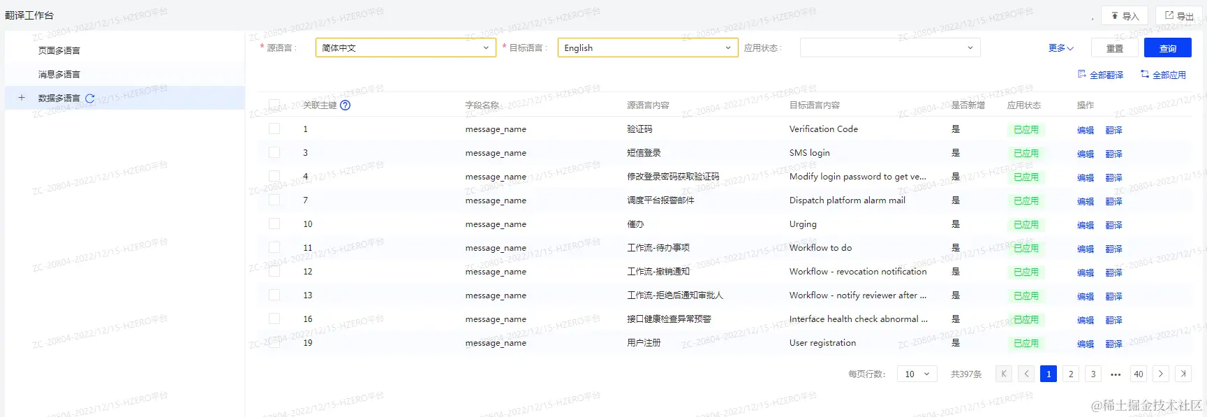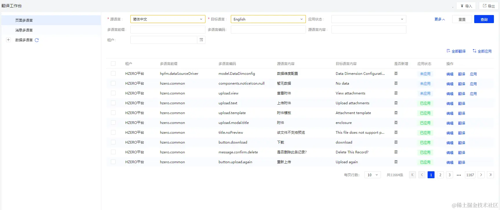 - 应用: 对于未应用(手动编辑或者执行翻译后)的数据可进行单条和批量应用。 应用后状态变为已应用,对应目标多语言数据会动态入库。