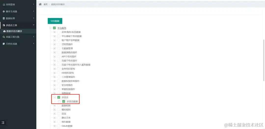 - 用户需要进入到数据多语言翻译界面,选择想要的翻译语言,并勾选具体需要翻译的模块数据。