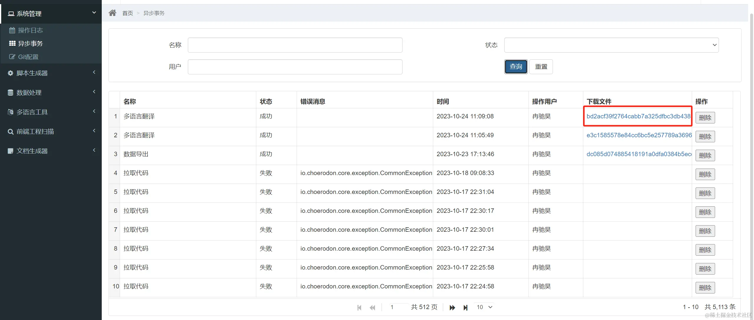 - 选择完成后,点击导出,到异步事务页面下载已翻译文件。