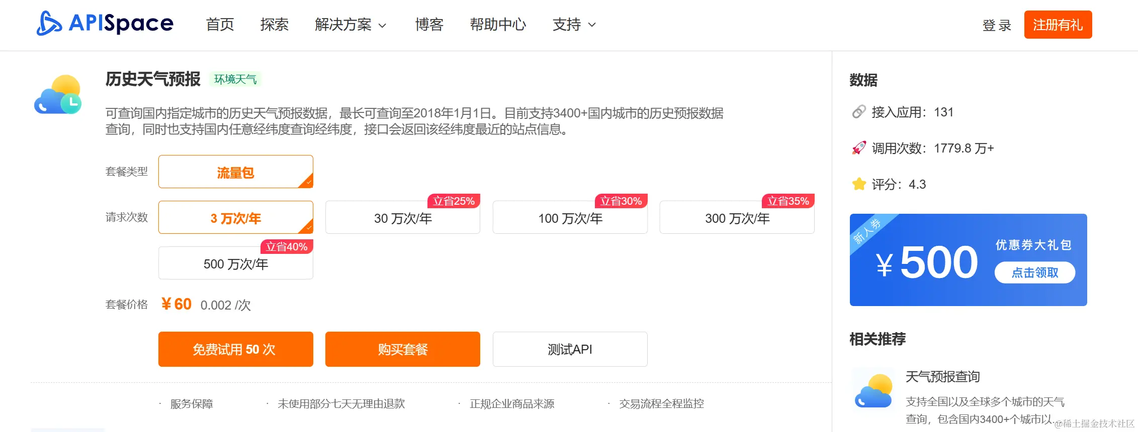 登录 APISpace,点击进入 历史天气预报 的接口详情页,就可以申请接口了。