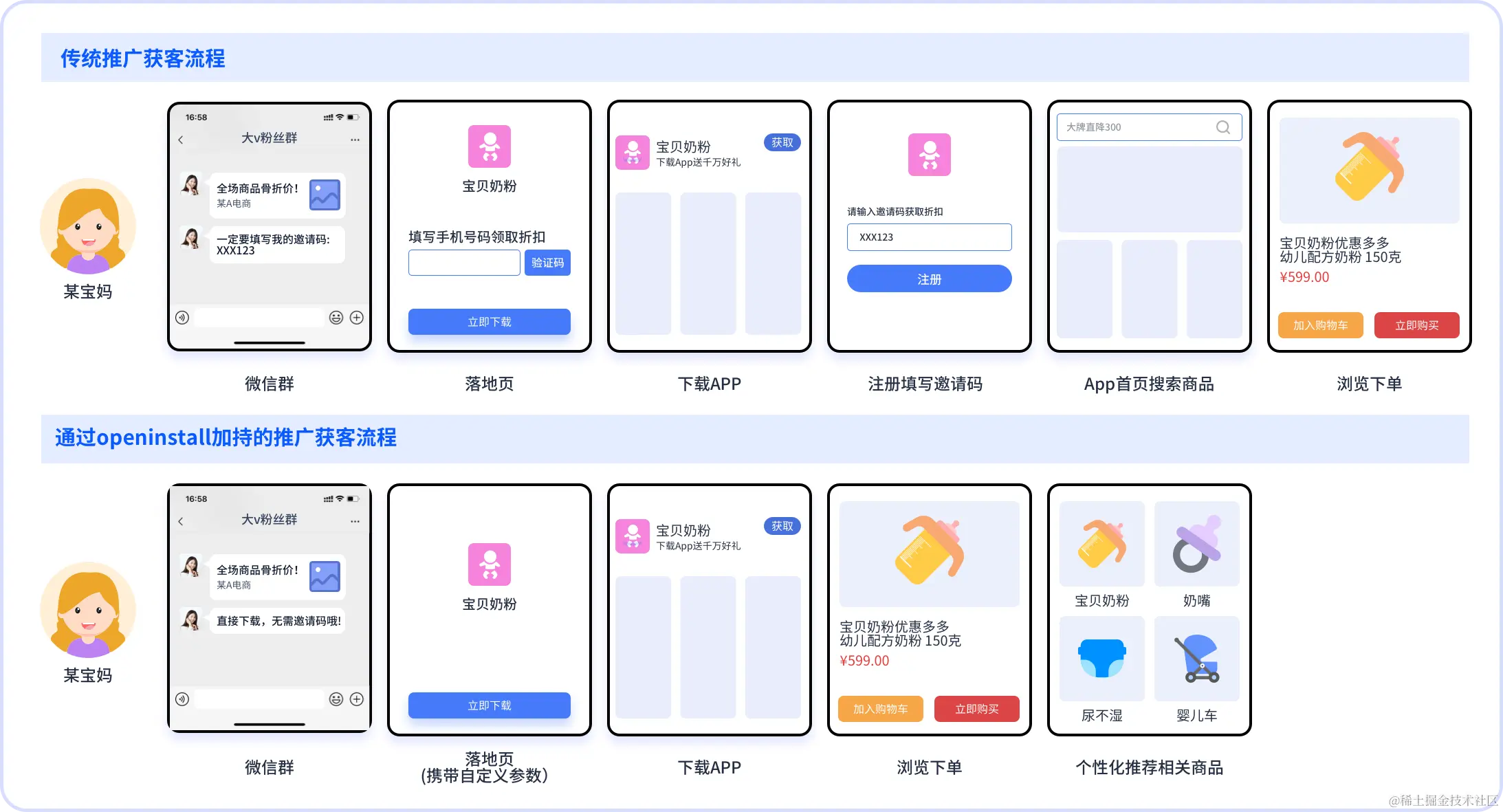 比如一个宝妈,在粉丝群里看到大V通过openinstall生成的邀请链接,访问后看中了优惠奶粉,只需点击下载按钮并打开登录,即可自动与大V绑定邀请关系,并且登录时页面会自动跳转优惠奶粉的页面,浏览下单的过程中,App还会推荐纸尿裤、婴儿衣服、玩具等刚需产品,或者育儿视频、月嫂上门等周边服务。