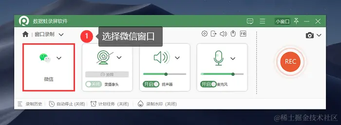 第2步:打开 “录窗口” 模式后,选择我们电脑微信的页面,规划好录制的区域,调整完毕后点击最右侧的红色 “REC” 按钮开启录屏。
