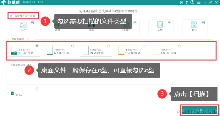 步骤2:选择需要扫描的文件类型,勾选需要扫描的磁盘(桌面文件一般会保存在c盘中),点击 【扫描】;