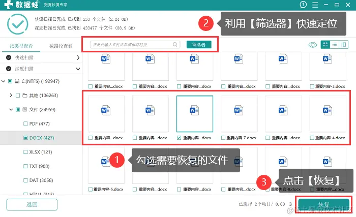 步骤4:深度扫描后,按步骤3方法再次选择需要恢复的文件,由于文件比较多,建议使用【筛选器】快速定位,完成选择后点击【恢复】 。